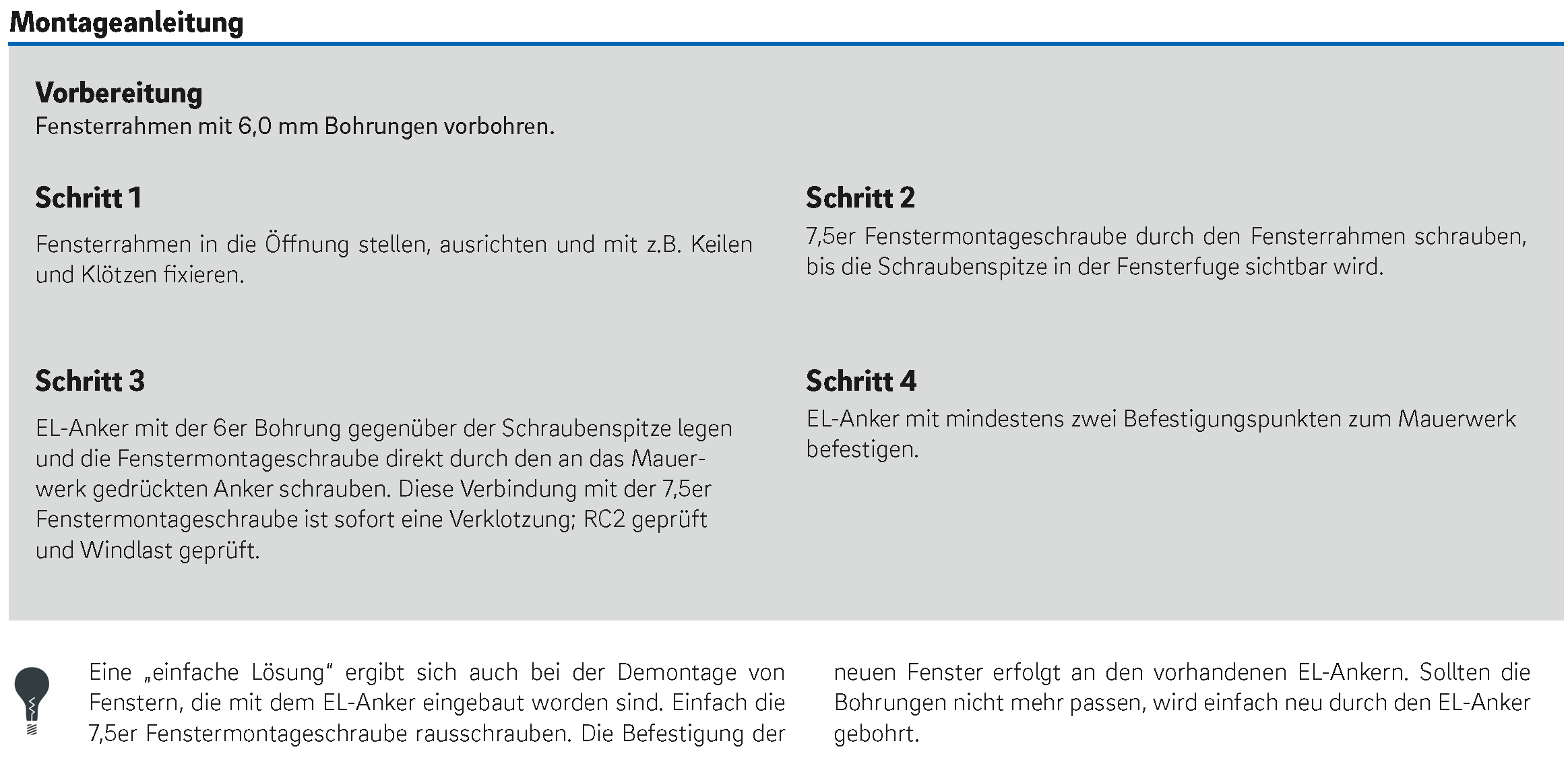 - die direkte Verschraubung durch das Fenster in den Anker ist eine geprüfte Verklotzung