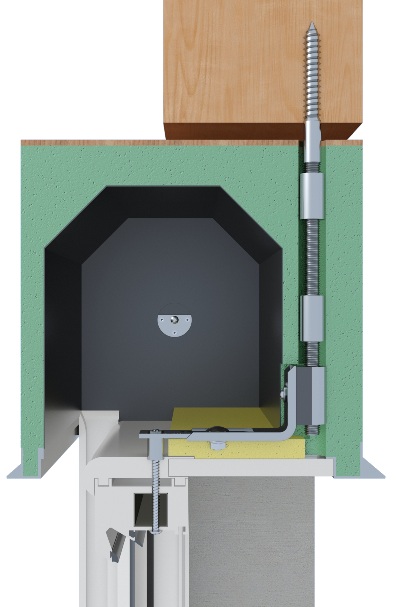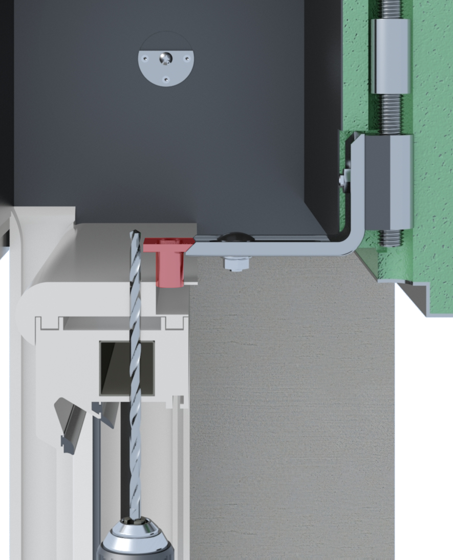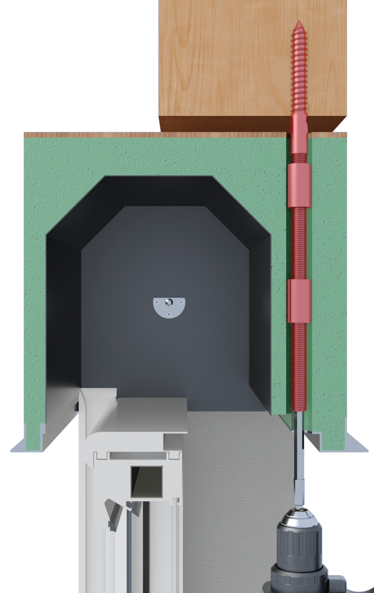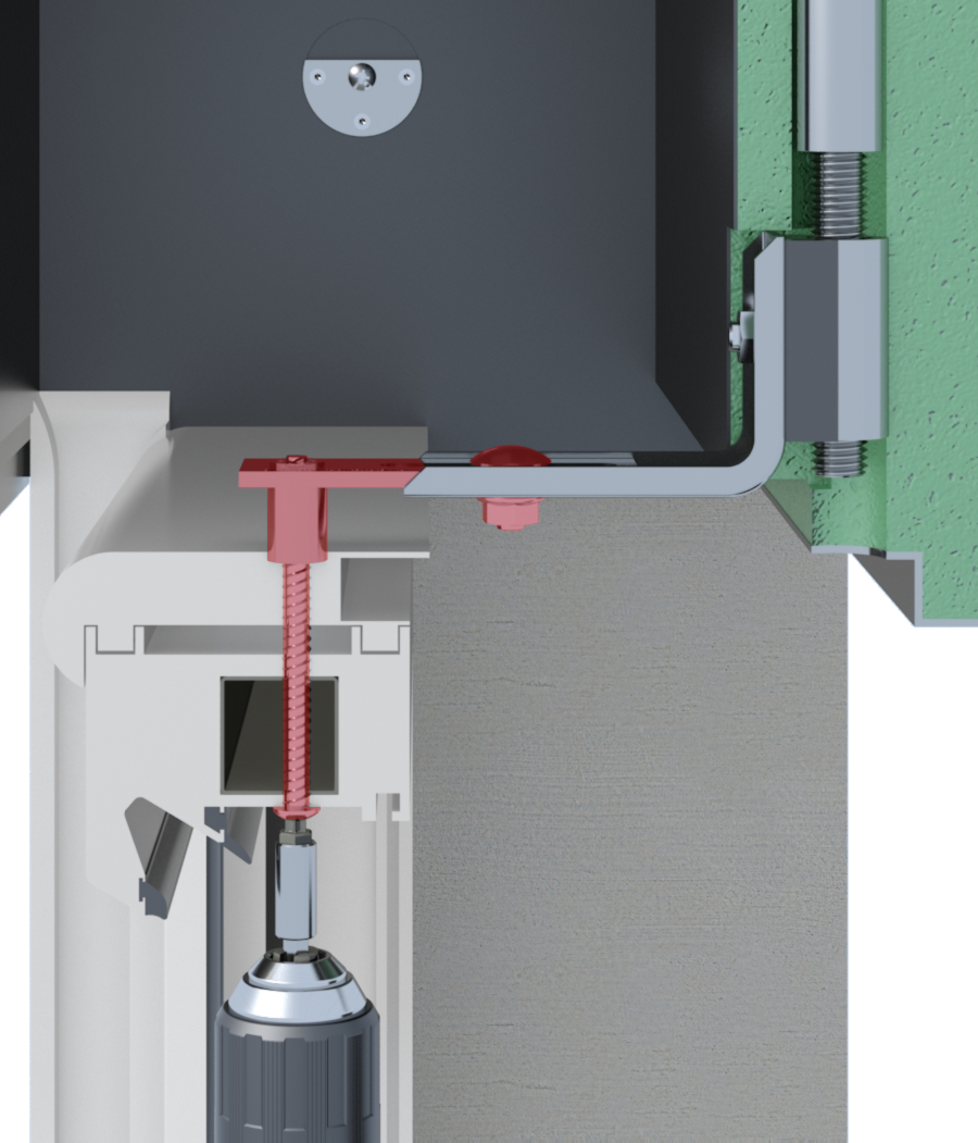 SS - Stockschraube␍2x Gewindebolzen: 1x M16x100 mit Antrieb␍1x M16x100, 1x Stockschraube M16x150␍2x Verbindungsmutter M16x40␍1x Verbindungselement␍VE-Menge 5 Stückeinfache Fensterbefestigung oben im Rollladenkasten␍überträgt Kräfte (Windlast, Flügel öffnen und schließen) direkt auf den Sturzbalken␍Freischneiden der Befestigungspositionen durch Bohren␍für alle Kastensysteme geeignet␍mit thermischer Trennung␍für die Befestigung am Holzsturz